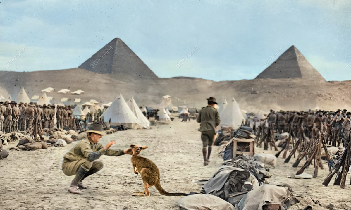 Австралийский солдат, играющий с кенгуру перед египетскими пирамидами Снимок, который был сделан во время Первой мировой войны на окраине Каира.