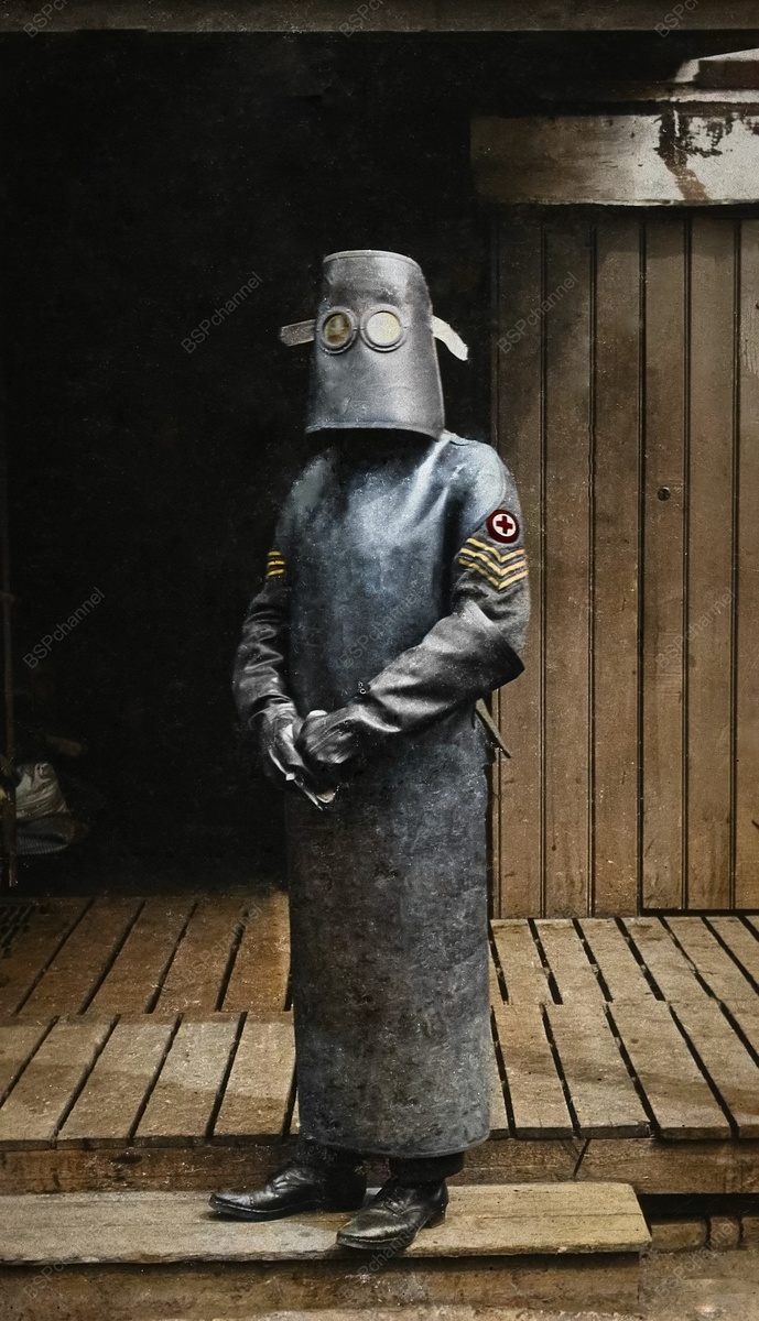 Рентгенолог в защитной одежде и шлеме. Первая мировая война, Франция, около 1918 года.