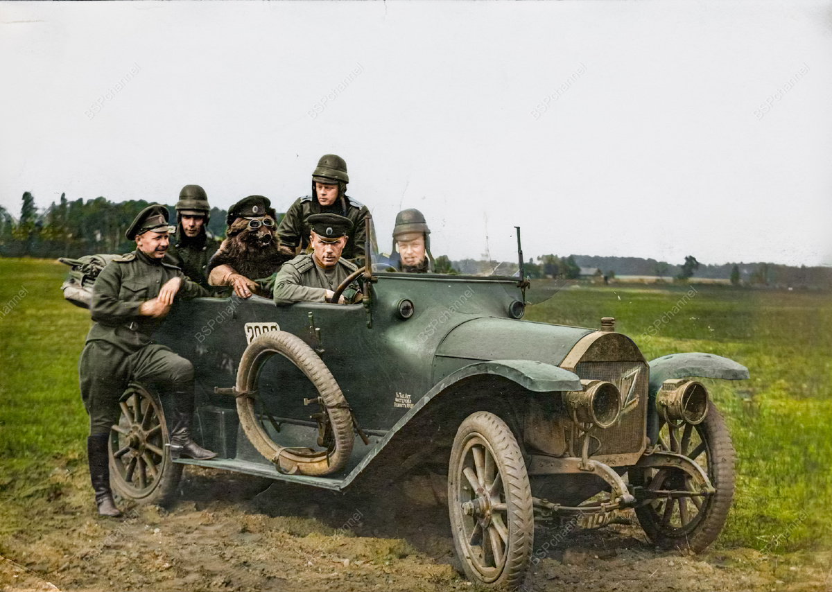 Медведь с российскими офицерами в германском "Бенце", 1915 год.