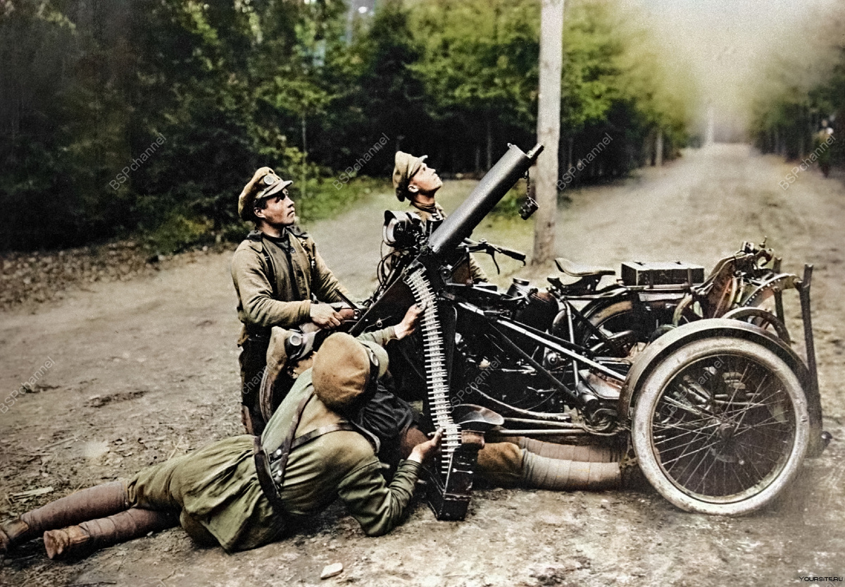 Военнослужащие действующей армии стреляют из пулемета по аэроплану во время Первой Мировой войны, 1916 год.