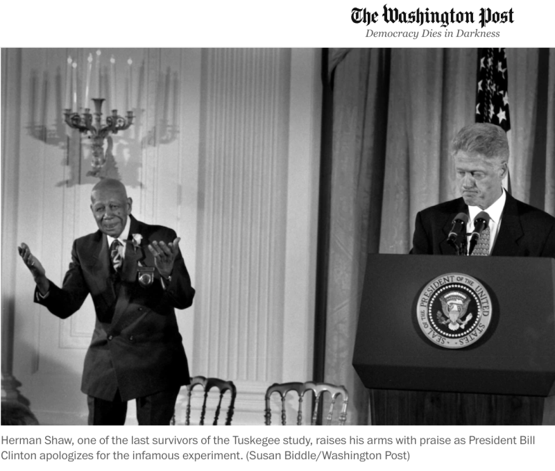 ГЕРМАН ШОУ, ОДИН ИЗ ПОСЛЕДНИХ ВЫЖИВШИХ В ИССЛЕДОВАНИИ ТАСКИГИ, ПОДНИМАЕТ РУКИ С ПОХВАЛОЙ, КОГДА ПРЕЗИДЕНТ БИЛЛ КЛИНТОН ИЗВИНЯЕТСЯ ЗА ПОЗОРНЫЙ ЭКСПЕРИМЕНТ. СКРИНШОТ-WASHINGTONPOST