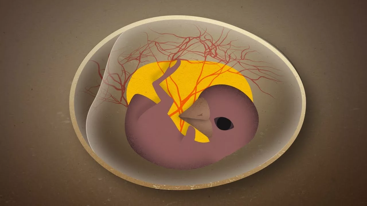Если заглянуть внутрь, то мы увидим, что обратная сторона скорлупы выстлана сетью кровеносных сосудов. Это специальный слой — хориоаллантоис. Это то, чем зародыш дышит. Оболочка заменяет эмбриону лёгкие и становится основным органом газообмена. Она длится тоже примерно 7-10 дней. За это время у эмбриона активно растут мышцы, связки, он покрывается перьями, и внутри тела формируются настоящие кости. Кальций на их формирование цыплёнок получает из скорлупы. К концу этого этапа птенчик занимает почти всё пространство внутри яйца. Уже почти готовый птенец, но если разбить яйцо сейчас, то он погибнет — жизнь должна постучаться изнутри.