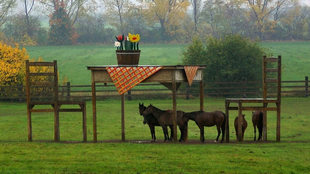 12. Гигантская мебель, созданная в рамках рекламной акции немецким торговцем древесиной, стала отличным навесом для лошадей