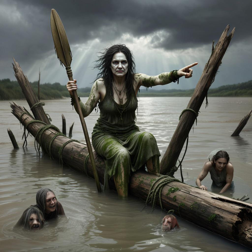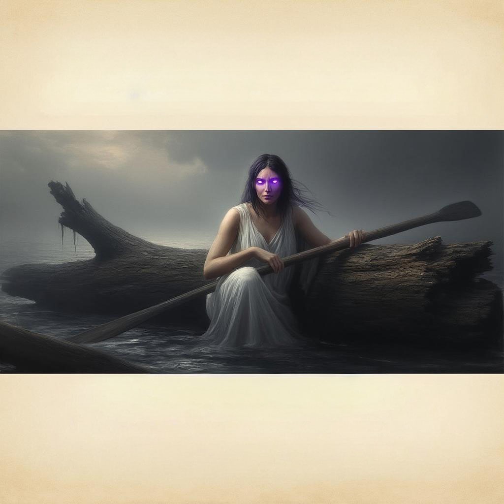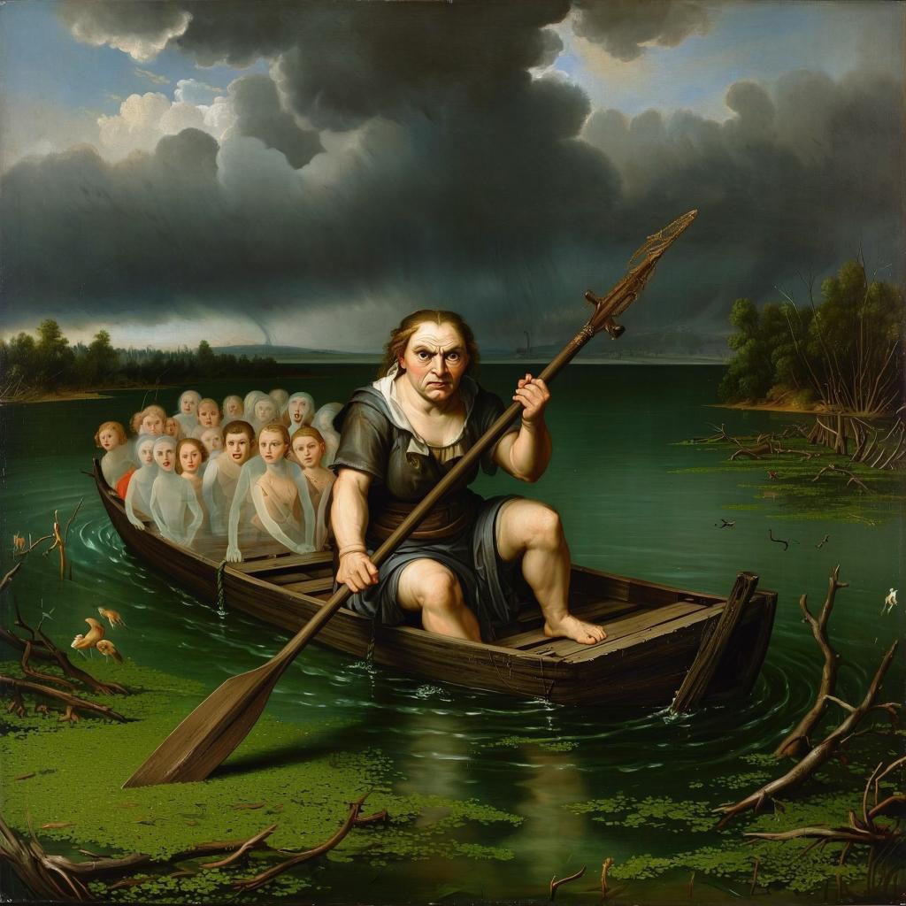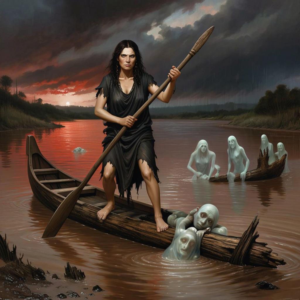 Запрос звучал "создай картину с Хароном-женщиной, перевозящей души через реку Стикс с веслом и на гнилом бревне." И так, приятного просмотра. Не судите строго ИИ он и в Африке ИИ.