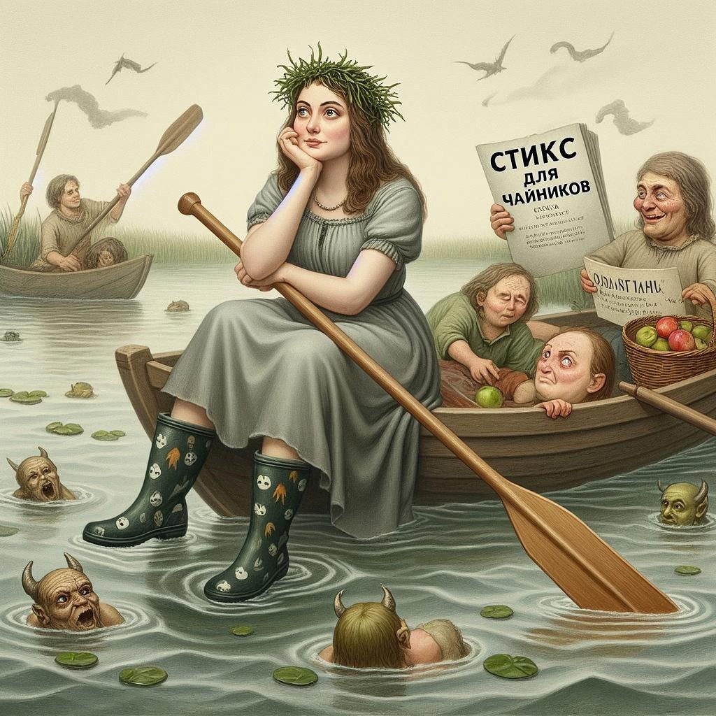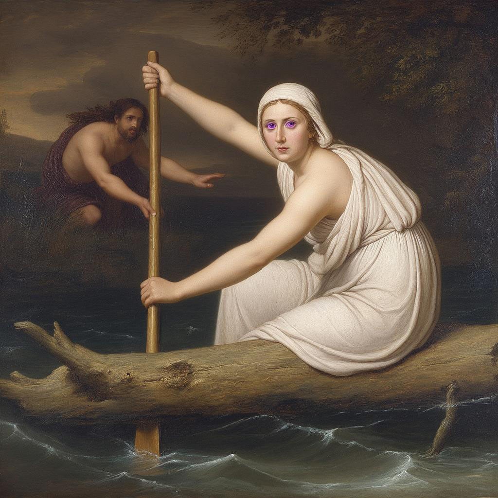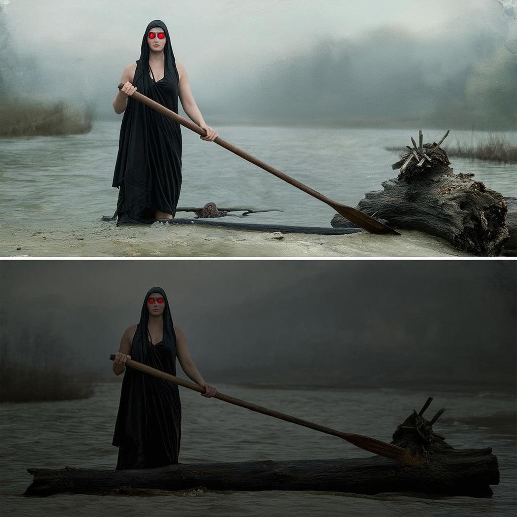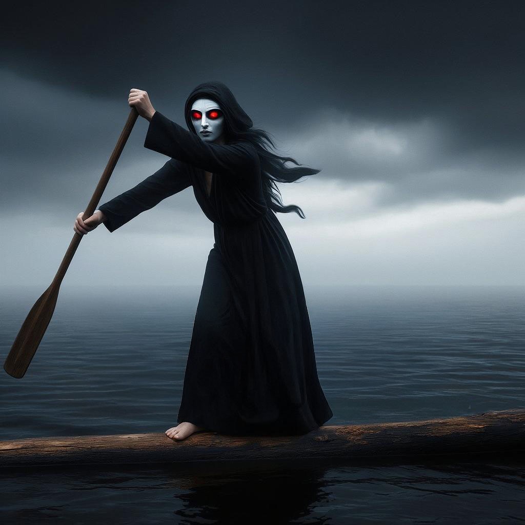 Запрос звучал "создай картину с Хароном-женщиной, перевозящей души через реку Стикс с веслом и на гнилом бревне." И так, приятного просмотра. Не судите строго ИИ он и в Африке ИИ.