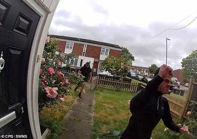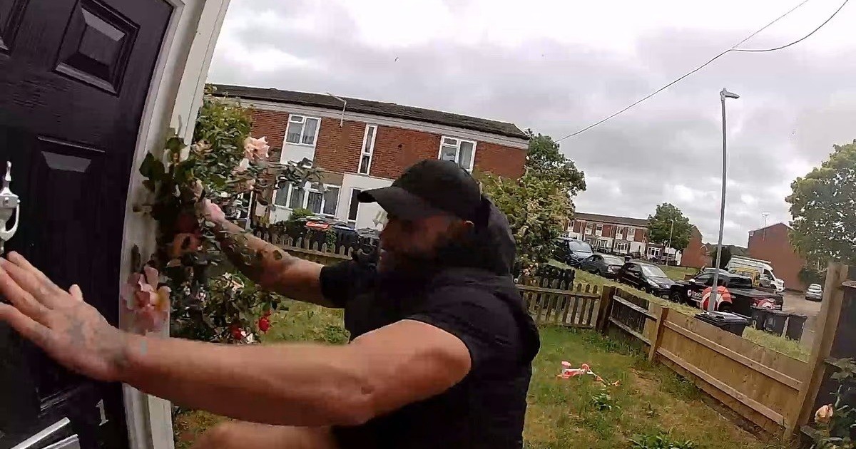 33-летний Алистер дубасил по двери и громко звал жильцов. Тем временем 32-летний Гарри наблюдал за происходящим из-за забора.