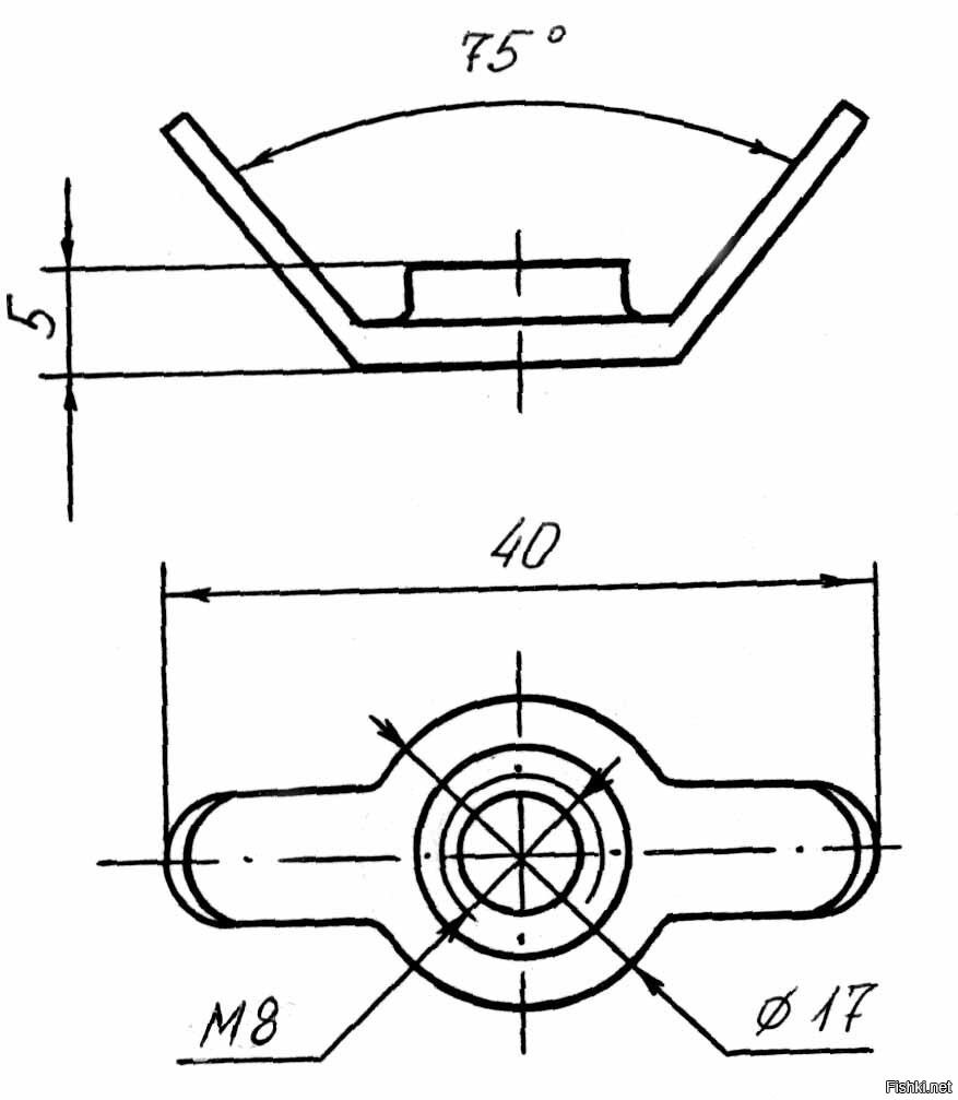Мы тоже делали на труде гайку - барашек , но из плоской заготовки 5 мм толщиной (примерно как на чертеже ниже), но "уши" загибали в тисках молотком, потом уже сверлили и резьбу нарезали.