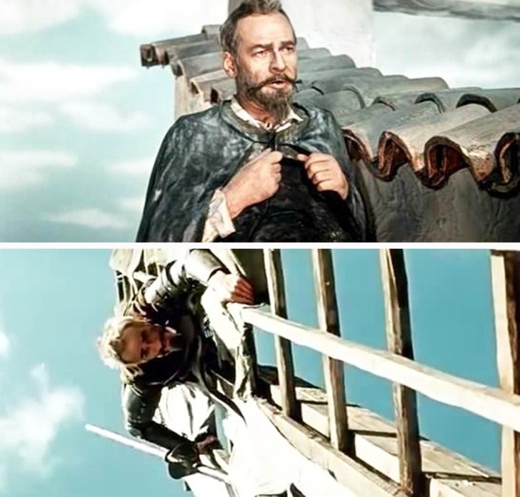 Исполнителю роли Дон Кихота пришлось выполнить сложный трюк в сцене борьбы рыцаря печального образа с ветряными мельницами. Дублер не пришел на съемочную площадку, и, чтобы не терять время, 53-летнего Черкасова привязывали к крылу мельницы и поднимали на 16 метров.