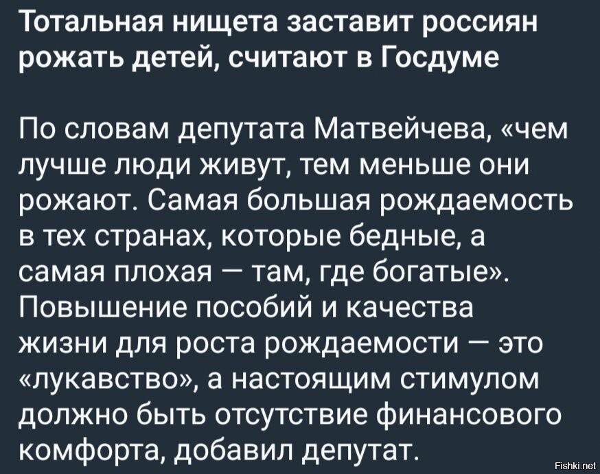 Только у государства есть право на убийство наших детей. Государству нужно больше мяса. И попиков вот подключили на агитацию. Я понимаю, что сказав это, Я нарушу пару статей УК. Но Вы уж меня извините. Бабе рожать мучаться. Воспитывать потом. Сколько денег уйдет опять же. Чтобы что? На СВО очередное потом отправлять. А вы думаете зачем им сейчас эта агитация? Ведь этих детей ещё воспитывать 18 лет надо. А это значит лишь одно, что в как минимум ближайшие 18-20 лет окончания войны не предвидится. Если только место боёв куда нибудь в другое место сместиться.