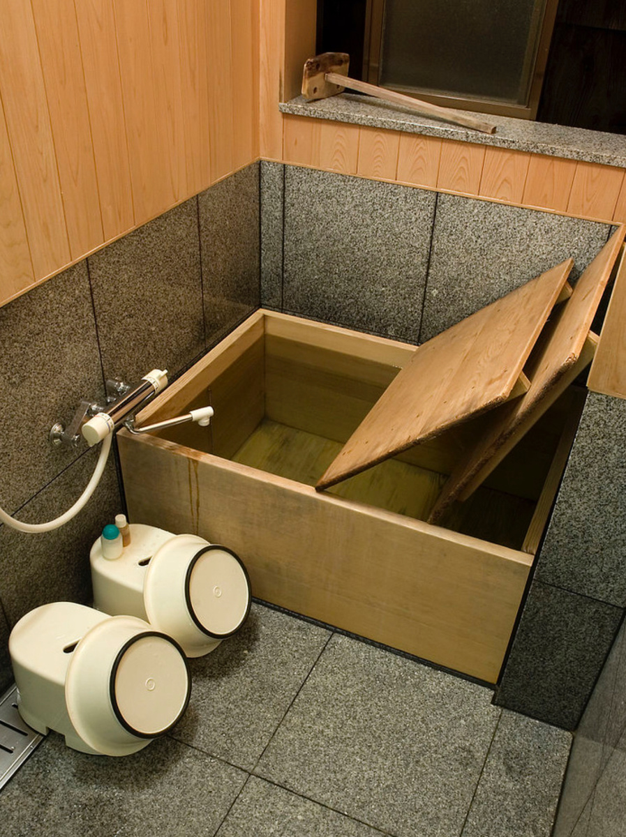 Чудом Японии являются ванны офуро, которые создавались из дерева. Но сегодня все чаще можно встретить ванны из пластика и нержавеющей стали. Ванны офуро стоят в каждой японской квартире. Принятие ванны — это как ритуал. Человек опускается в воду по плечи и закрывается деревянной крышкой, которая помогает сохранить тепло.