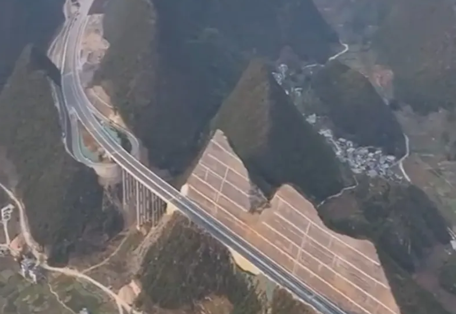 В провинции Гуйчжоу, где более 90% территории занято скалами и хребтами, прокладка трассы по ровной местности невозможна. Поэтому проектировщики решили прорезать скалы и соединить их мостом, перекинутым через глубокий каньон. Так появилось звено новой скоростной магистрали, которая должна связать несколько городов и сократить время в пути для автомобилей.