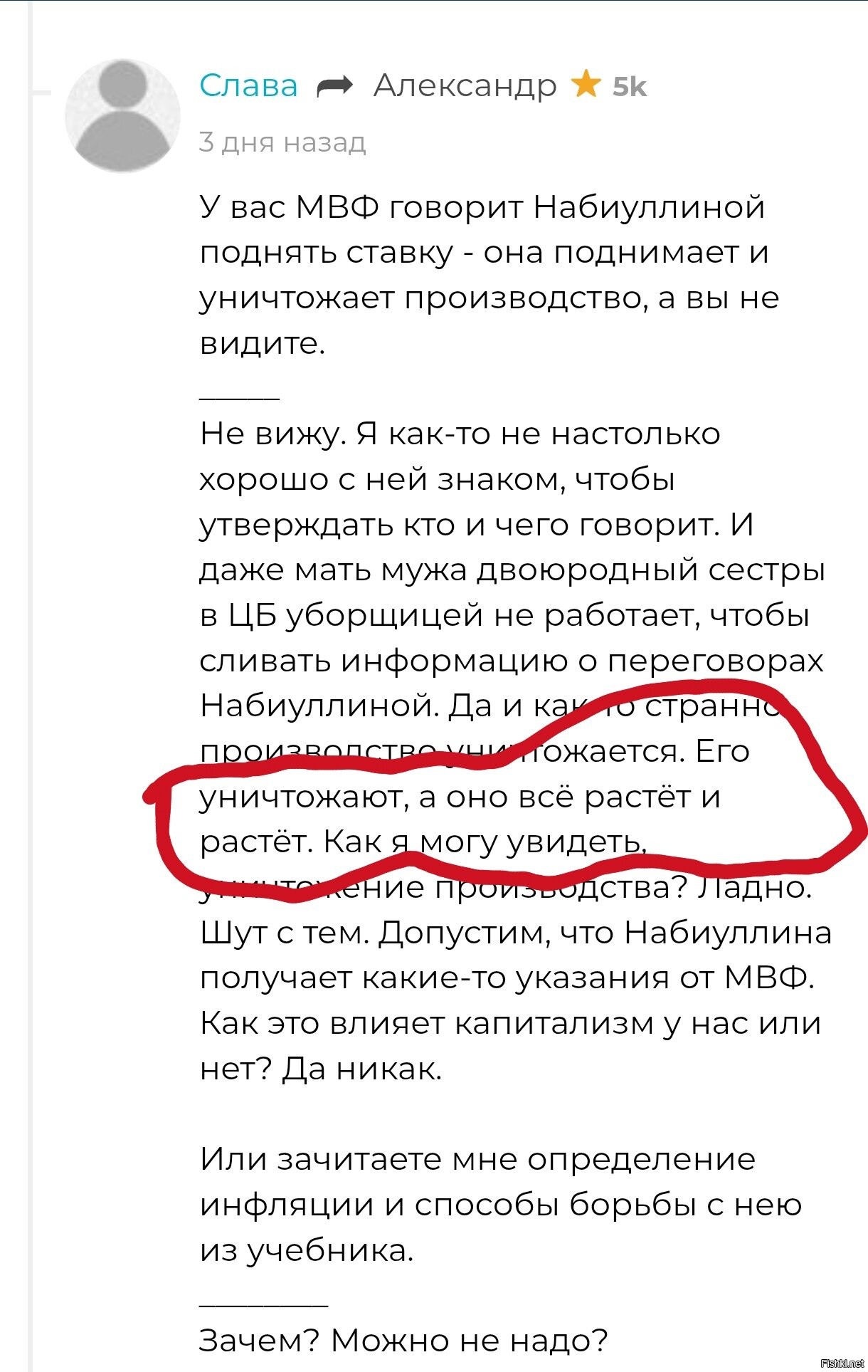Так нет аргументированной критики. Есть голословные заявления "они сливают", потом выясняется, что это рецессия. И еще что-то про то, что ты гений в экономике. Хочу низкую ставку, чтобы производство росло. Что-то еще?