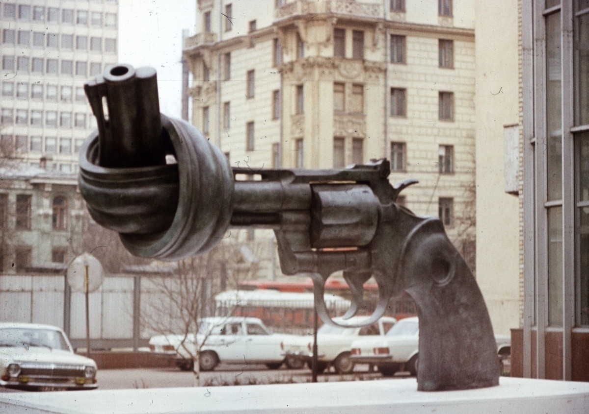 Вот такой необычный памятник под называнием "Нет насилию" можно было увидеть в Москве конца восьмидесятых на проспекте Мира.