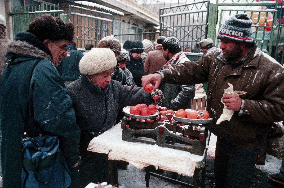 Торговля хурмой у ворот Черёмушкинского рынка.