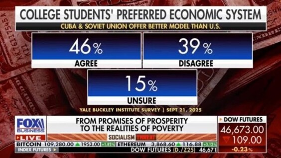 Онлайн-опрос 820 студентов четырёхгодичных колледжей, проведённый ранее в этом месяце Институтом Уильяма Ф. Бакли при Йельском университете, показал, что 46 % студентов согласны с тем, что социализм — лучшая модель, чем капитализм, а 39 % не согласны. В то же время 40 % заявили, что предпочли бы жить при капитализме, а 36 % — при социализме.