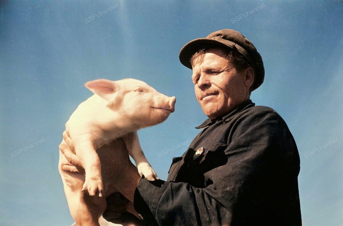 Рабочий и поросенок. СССР, год и место съемки неизвестны.
