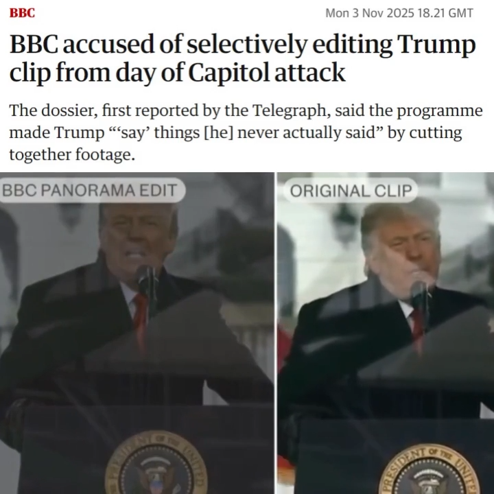 В той программе показали фрагмент речи, произнесенной Трампом 6 января 2021 года, в день приснопамятного «штурма Капитолия» толпой его сторонников, несогласных с итогами выборов (это когда победил Байден). Из эфира «Би-Би-Си» следовало, что Трамп подстрекал людей к штурму. Но в том фрагменте речь президента склеили из разных кусочков и в итоге вышла фраза, которой тот на самом деле не говорил. Вот сравните: