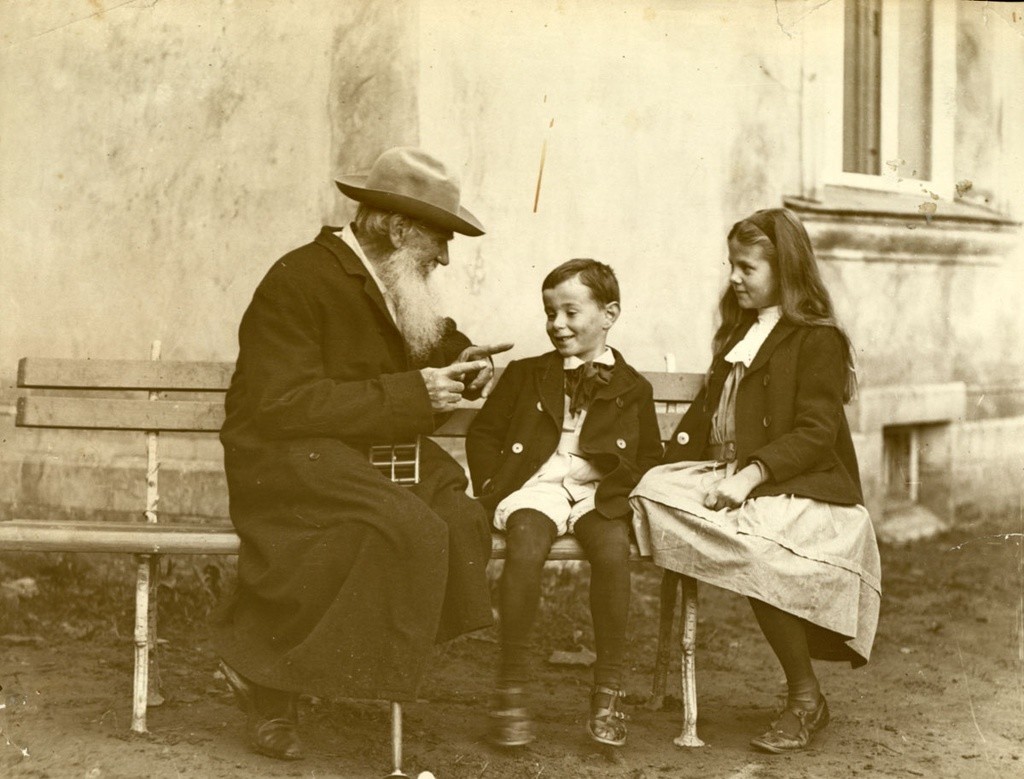 Лев Толстой рассказывает сказку об огурце внукам Соне и Илюше. 1909 год. Автор: Владимир Чертков. Московская губерния, деревня Крекшино.
