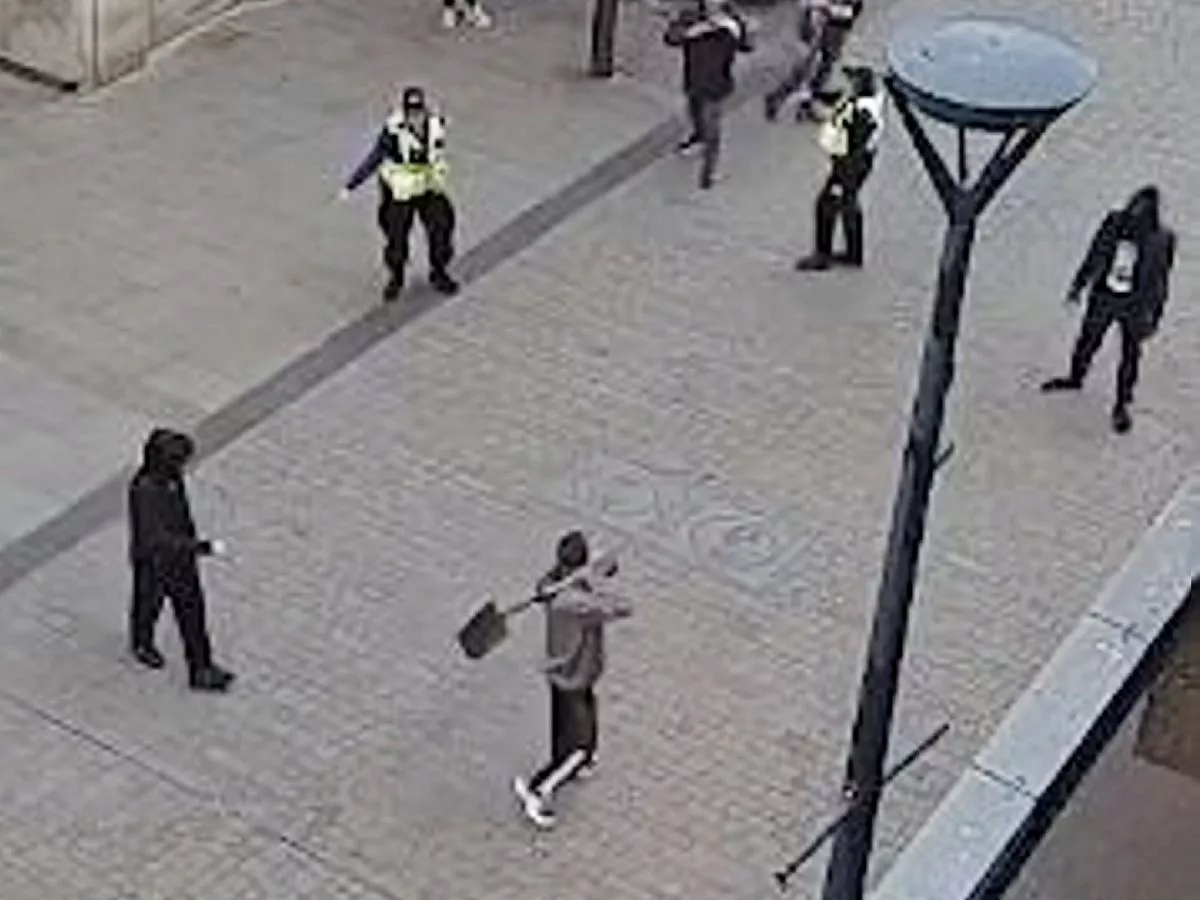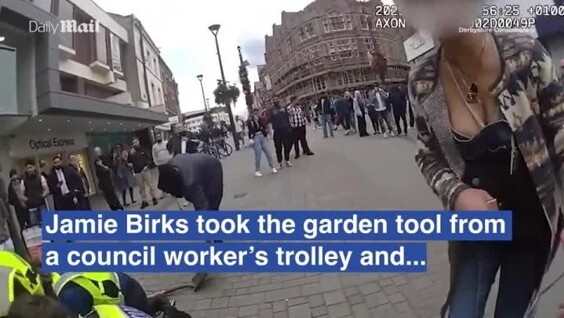 Джейми Биркс схватил садовую лопату с тележки дворника и устроил дебош в центре Дерби, Англия. Двое полицейских попытались его успокоить, но мужчина остановился только после того, как его повалил прохожий.