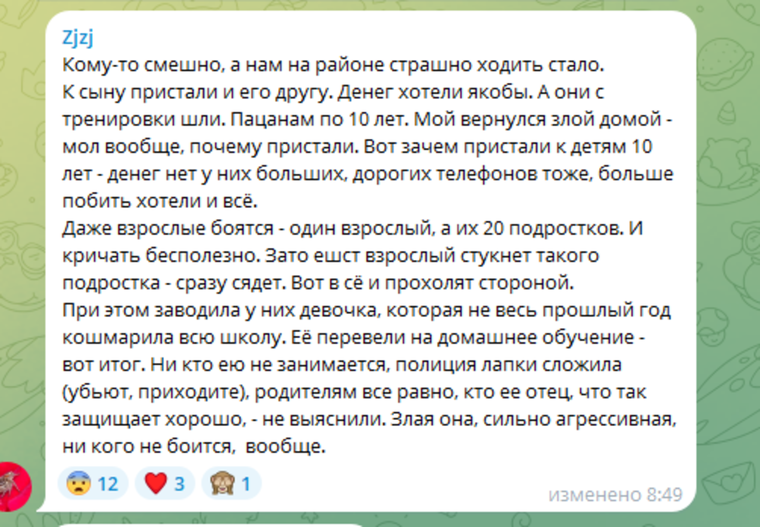 Местные жители сообщают, что пацанами руководит 16-летняя девочка, которую перевели на домашнее обучение.