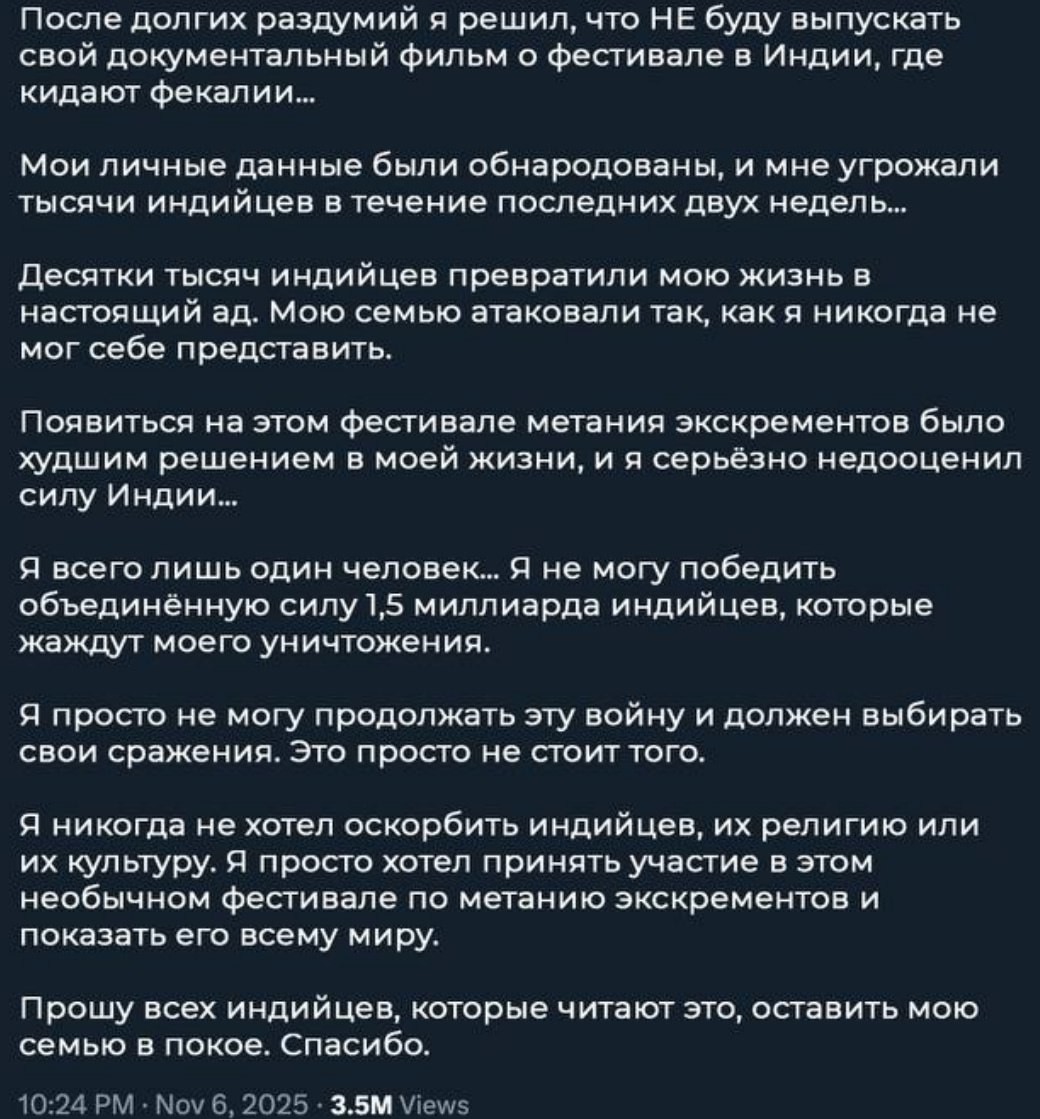 Индийцы взорвались, под видюхой появились тысячи комментариев: «Ты издеваешься над нашей религией!», «Расист, показываешь Индию как помойку!», ну и всё в том же духе.
