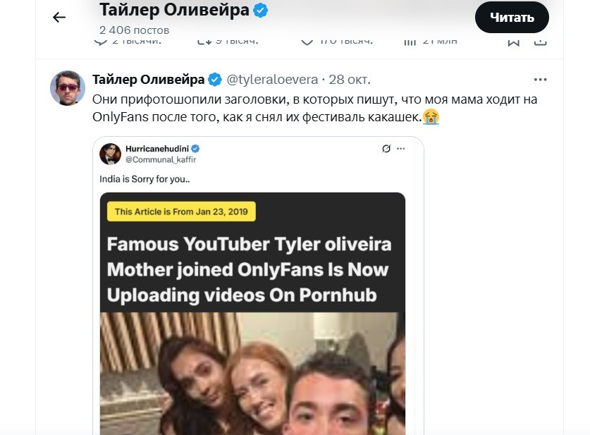 Тайлер Оливейра, двадцатипятилетний ютубер, прилетел в Индию на фестиваль Горехабба в деревне Гуматапура штата Карнатака. Там люди веками кидаются сушёными лепёшками коровьего навоза. Это символ плодородия, единства и веры. Тайлер надел защитный костюм, снял тизер под названием «Внутри индийского фестиваля метания какашек» и выложил его в соцсети 23 октября. Мы, кстати, об этом писали — читать здесь.