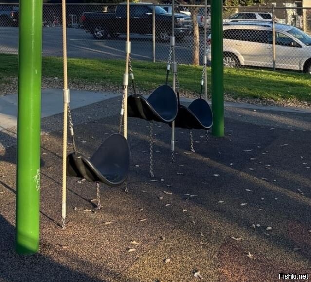 10. Металлическая конструкция в соседнем парке высотой 2,4 метра, с тремя качающимися пластиковыми сиденьями, прикреплёнными цепями к земле и друг к другу