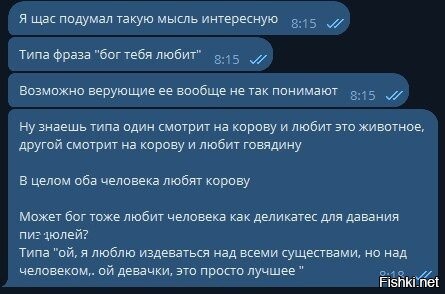 Я не воспринимаю религиозные россказни всерьез. Для меня они сродни историй про зомби, леших, зубной феи, человека-паука и такой подобной чепухи. Рассуждать всерьез о мифологических байках смешно. Строить логические цепочки рассуждений и объяснений на основе библейских баек глупо и неразумно. Но было интересно, да. Удачи
