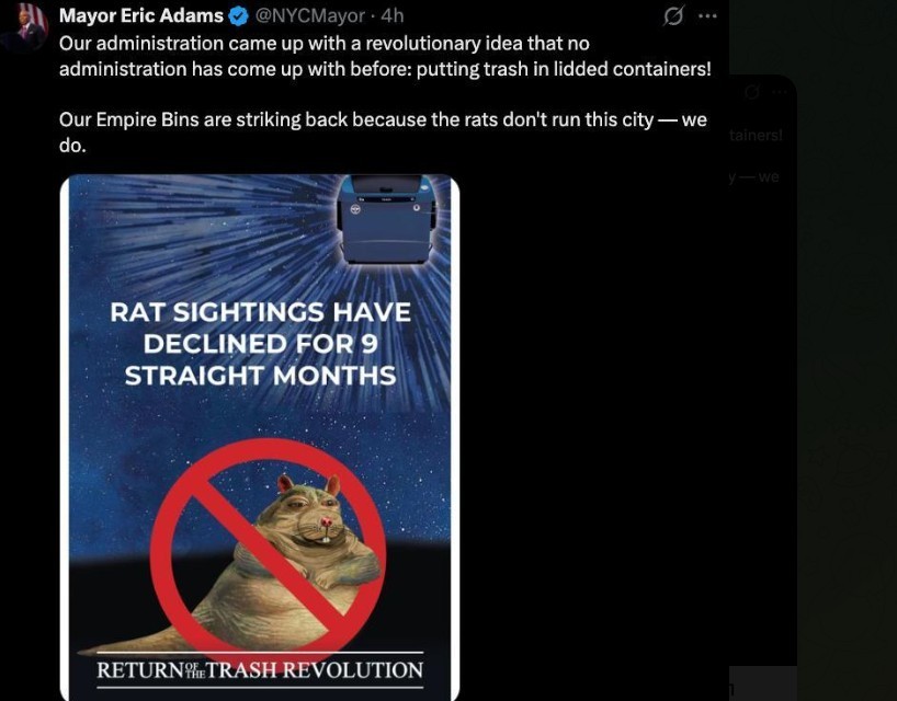 Мэра уже было не остановить, в октябре этого года он, опьянённый успехами борьбы с крысами, опубликовал мем: Джабба Хатт с мусорным мешком и урна как «Звезда смерти». Подпись шедевральная — «Революционная идея!». Интернет отреагировал сарказмом: «Нью-Йорк изобрёл мусорку в 2025-м?»