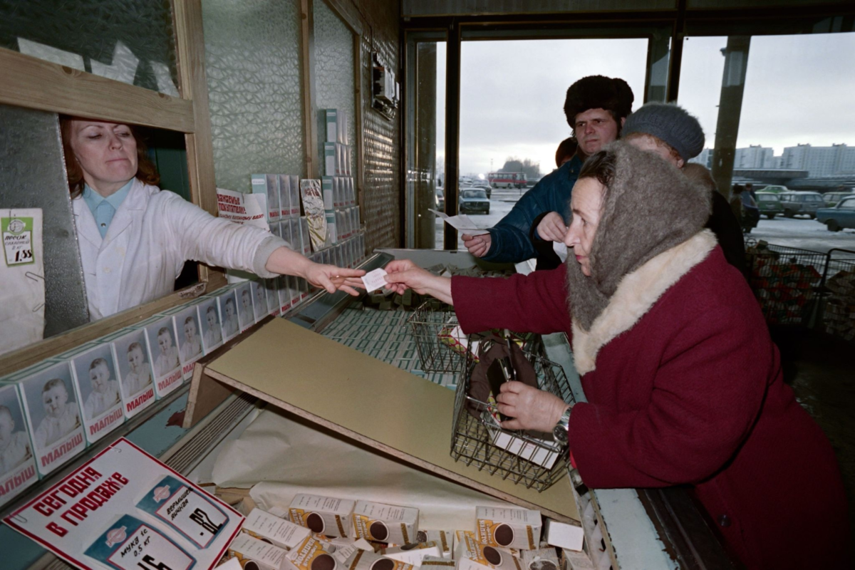 Женщины смотрят на мясное "изобилие" в гастрономе на улице Желябова (ныне - Большая Конюшенная)
