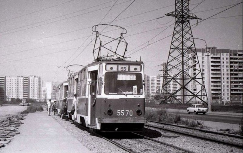 Снимок трамвая 55 маршрута на углу проспекта Испытателей и улицы Маршала Новикова.