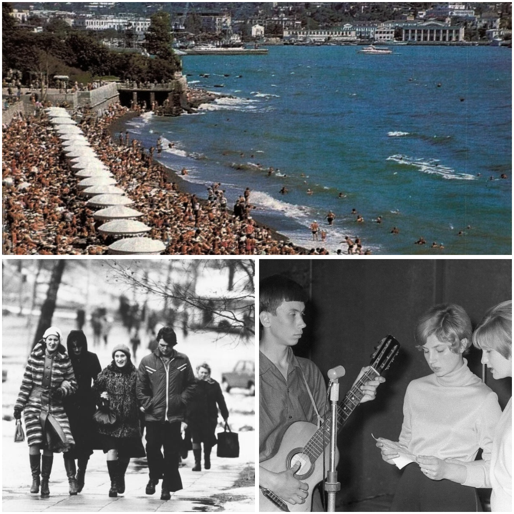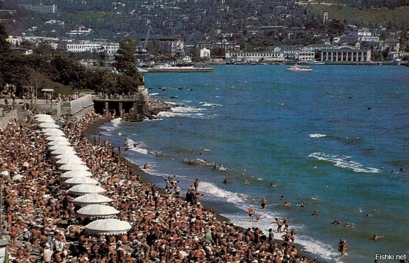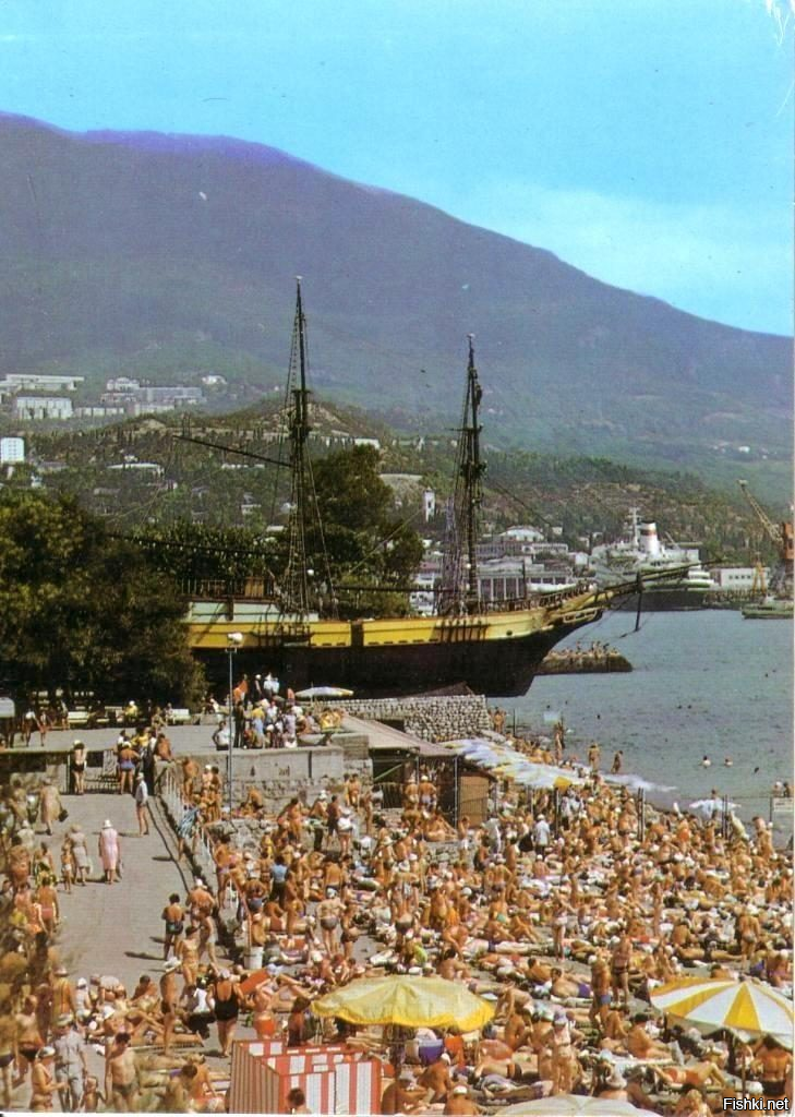 2. Ялта. Пляж гостиницы "Ореанда" до 1974-го года. (Два слова из биографии парусника. Его перестроили на верфи в Херсоне, специально для киносъемок. Он участник фильмов «Остров сокровищ», «Дикий капитан», «Робинзон Крузо». Менялось соответственно и название судна: «Эспаньола», «Фортуна», «Виктория»… Потом он оказался без дела. В мае 1974 года его привели в Ялту на стоянку, тем более что здесь на киностудии им. М. Горького он был раньше «прописан». В красавицу бригантину «Испаньола» превратилась из трудовой черноморской рыболовецкой парусно-дизельной шхуны с грозным именем «Клим Ворошилов». Автор проекта переоборудования шхуны научный сотрудник Военно-морского музея в Ленинграде Андрей Ларионов. Вот и вся его творческая биографии.