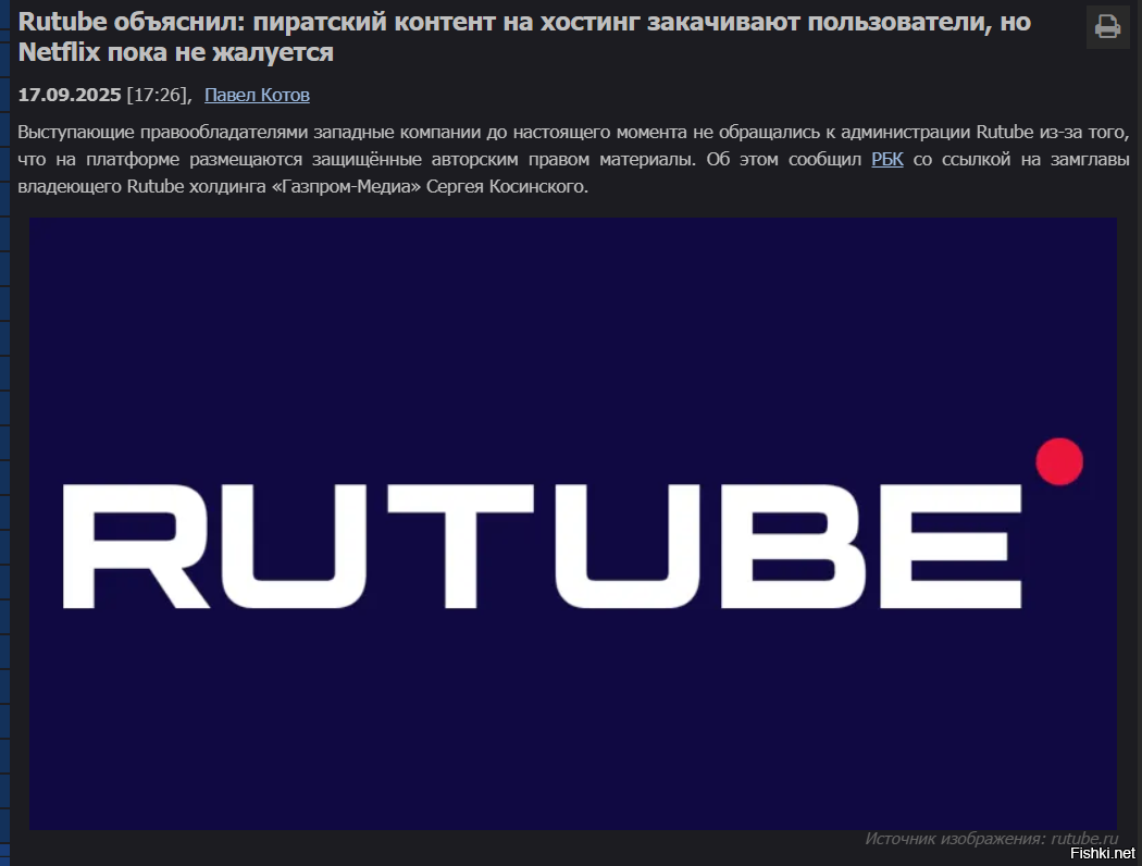 "Если на Rutube появляются пиратские материалы, то ответственность за их размещение лежит на пользователях платформы, заявил топ-менеджер. На сервисе могут находиться, например, сериалы западных потоковых платформ, которые ушли из России, и «если напишет Netflix и предоставит доказательство, что этот контент принадлежит им», то Rutube готов принять меры; но пока таких обращений не было, отметил господин Косинский."