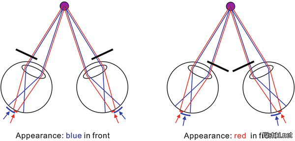 Это явление называется хромостереопсис. Оно заключается в избирательном восприятии мозгом цветовых спектров. Наше сознание склонно интерпретировать более длинные волны, ассоциируемые с красным цветом, как находящиеся на более близком расстоянии, в отличие от коротких волн синего спектра, даже при их фактическом расположении на одной линии. Этот оптический эффект становится ещё более выраженным при контрастном соседстве цветов.