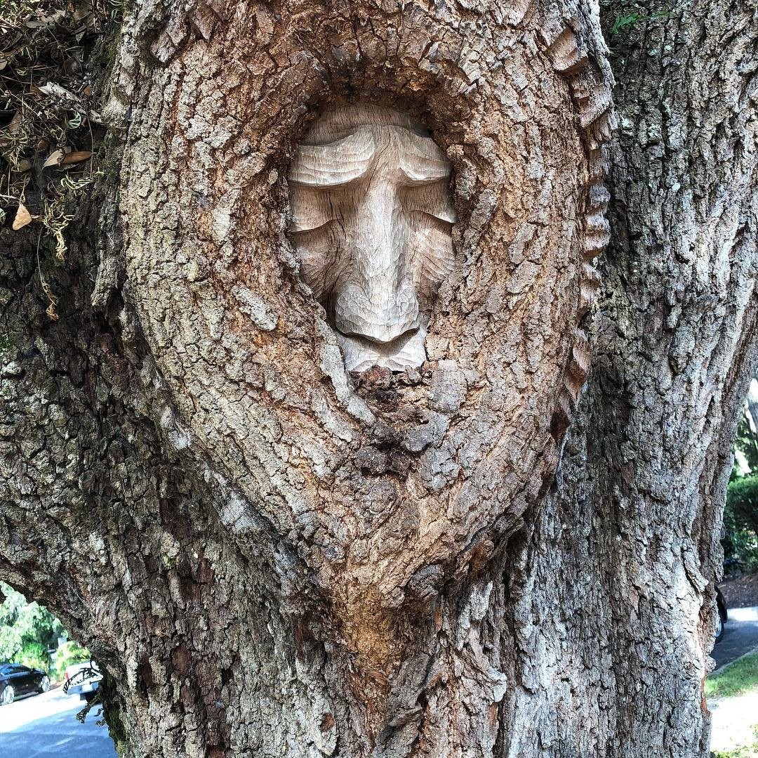 На острове Святого Саймона, барьерном острове у побережья Джорджии, прямо из глубин стволов старых раскидистых дубов на прохожих взирают вырезанные лики.