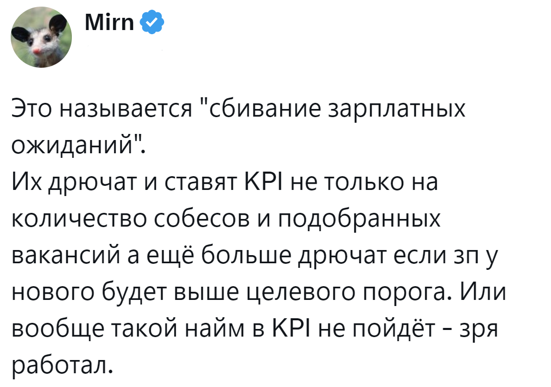 А вот с последним нередко возникает проблема. На собеседовании менеджер по персоналу вдруг начинает предъявлять претензии по поводу последнего. Дескать, опыт кандидата не соответствует предлагаемой вакансии. Хотя в резюме всё чётко указано. Да в телефонном разговоре эти моменты предварительно выясняются, чтобы не тратить время друг друга. Пользователи поразмышляли об этой странной тенденции, предложили свои версии и сошлись во мнении, что причина чаще всего банальная – поменьше платить и заставлять побольше работать.
