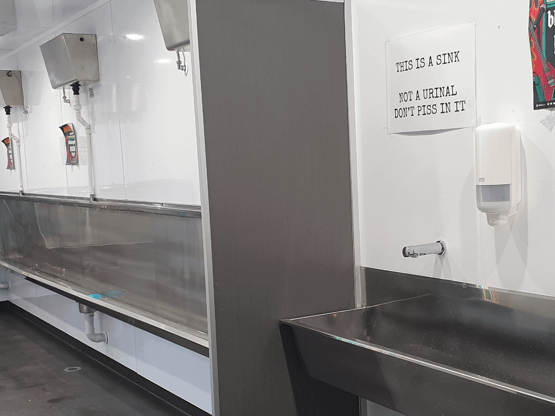 Раковины, похожие на писсуары, рядом с настоящими писсуарами…