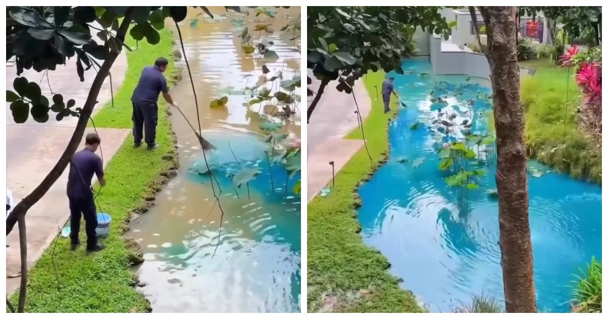 В декоративных водоёмах на азиатских курортах, где мутная вода может испортить всю картину, часто прибегают к окрашиванию, чтобы вода выглядела чище и привлекательнее. Для этого используют специальные нетоксичные красители для прудов — они абсолютно безопасны как для рыб, так и для растений.
