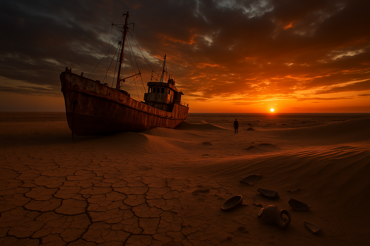Город Муйнак, бывший процветающим портом с 21 миллионом банок консервов в год, оказался в сотне километров от берега. Теперь это город-призрак. На высохшем дне стоит кладбище кораблей Аральского моря — ржавые корпуса, будто выброшенные морем на белую корку соли.