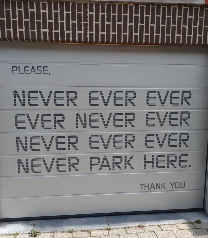 Гаражная дверь в доме напротив. «Пожалуйста, никогда, никогда, никогда, никогда не паркуйся здесь. Спасибо».