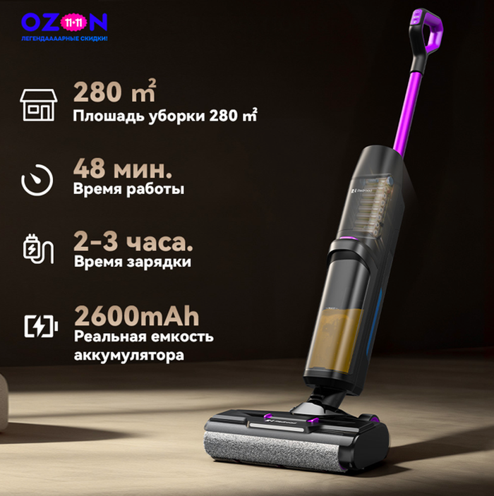 Одного заряда хватает на 3–4 полных цикла уборки в квартире площадью 70 м². Интеллектуальная система управления батареей регулирует мощность в зависимости от загрязнения: на чистых участках — экономия энергии, на загрязнённых — максимальная эффективность. Устройство подстраивается под задачи уборки, обеспечивая идеальное соотношение мощности и времени работы.