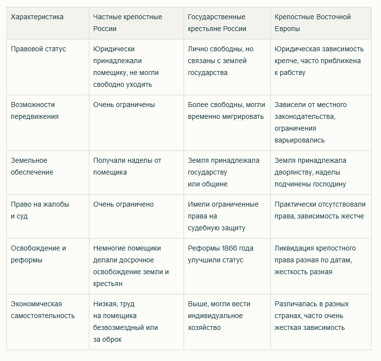 Собрал в таблице информацию о том, чем отличались друг от друга крепостные по правам и возможностям: