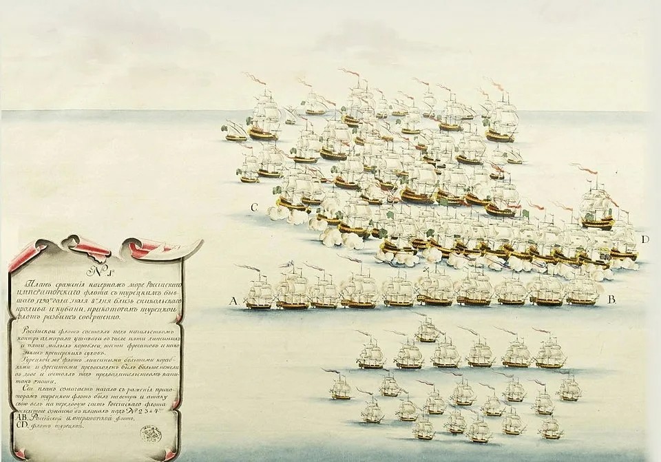В Эгейском море русский флот под началом графа А. Г. Орлова, загнав османский флот в Чесменскую бухту, практически полностью уничтожил его с помощью артиллерии и брандеров. За этот разгром командующий получил почётную приставку к фамилии — «Чесменский».