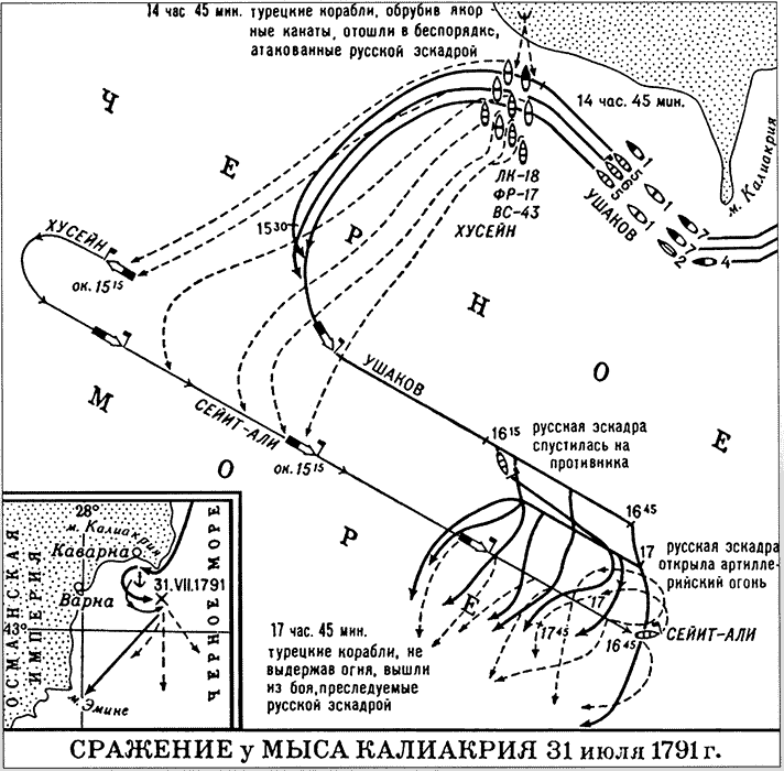Вице-адмирал Ф. Ф. Ушаков, сконцентрировав удар на флагмане турецкой эскадры, направлявшейся для завоевания Крыма, обратил противника в бегство. Императрица Екатерина II выразила командующему «великое спасибо».
