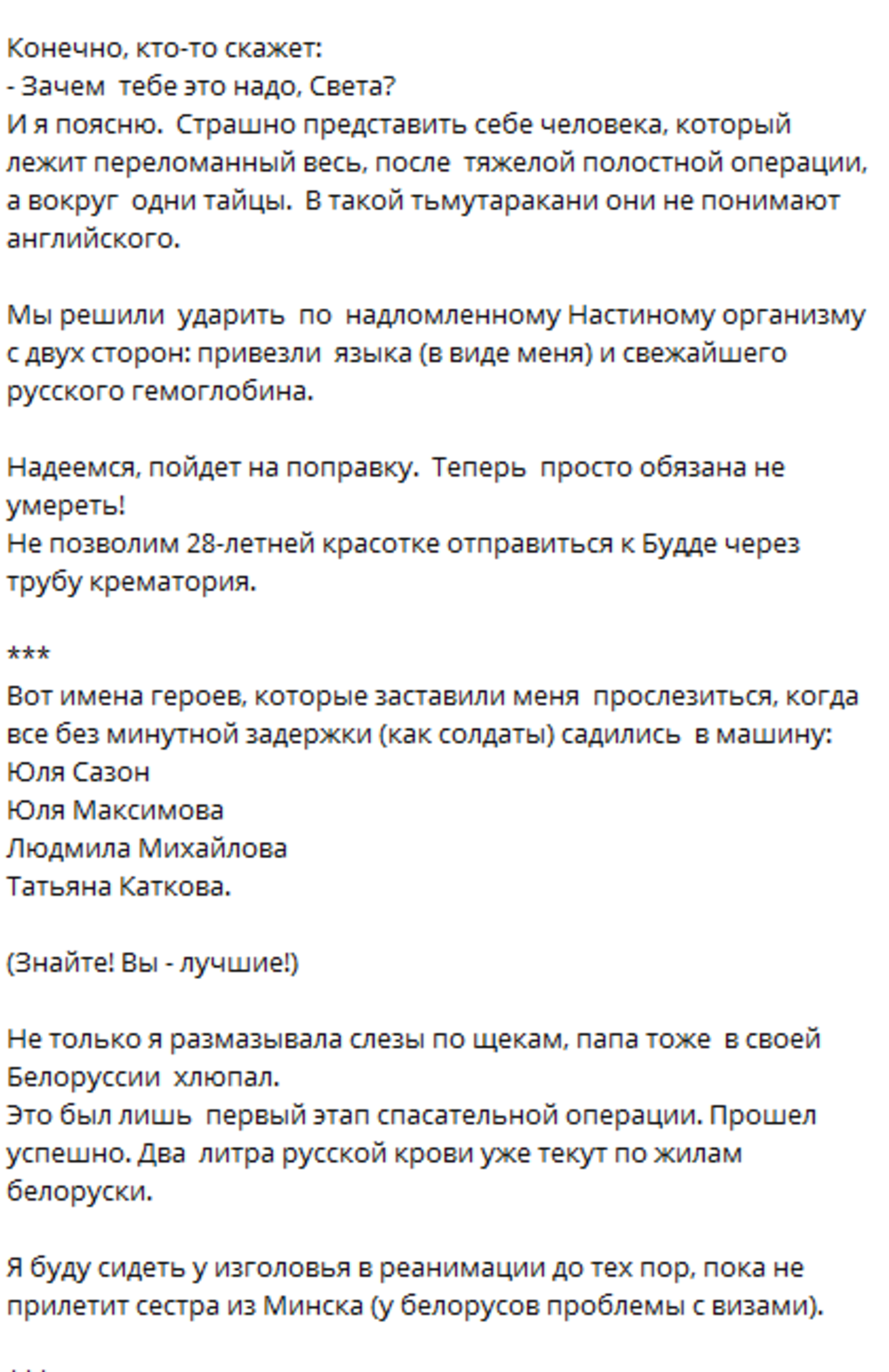 Несмотря на усталость и даже кратковременную потерю сознания одной из доноров, сдача крови прошла успешно, состояние белорусской туристки стабилизировалось, угроза жизни исчезла.