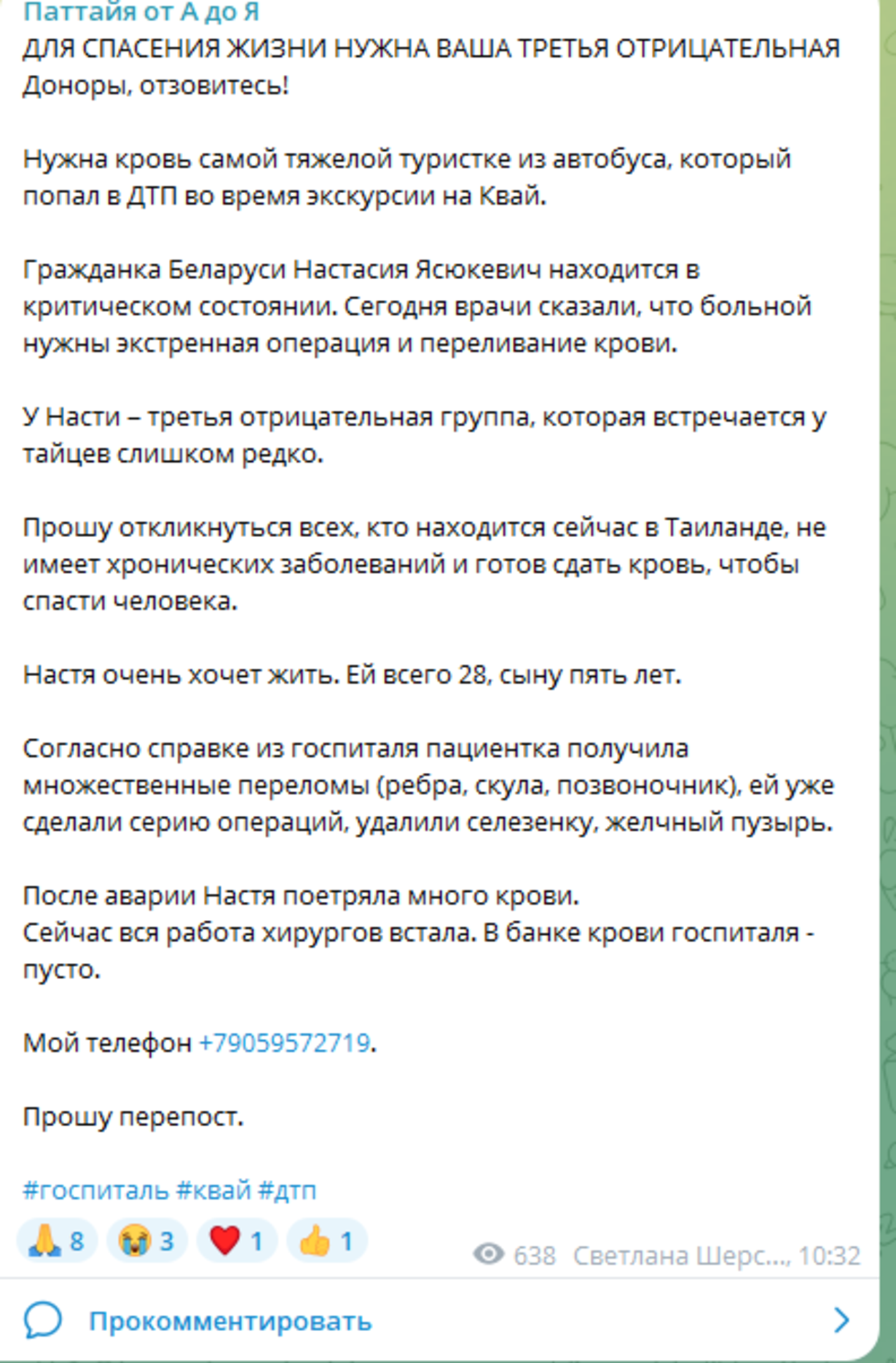 Местный банк крови не смог обеспечить нужный запас, поскольку отрицательный резус - большая редкость для тайцев. Волонтёр и администратор группы в соцсетях «Паттайя от А до Я» Светлана Шерстобоева опубликовала несколько постов в соцсетях, на которые откликнулись добровольцы, согласившиеся стать донорами.