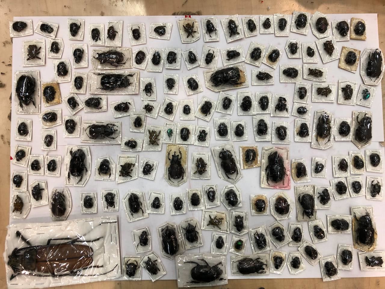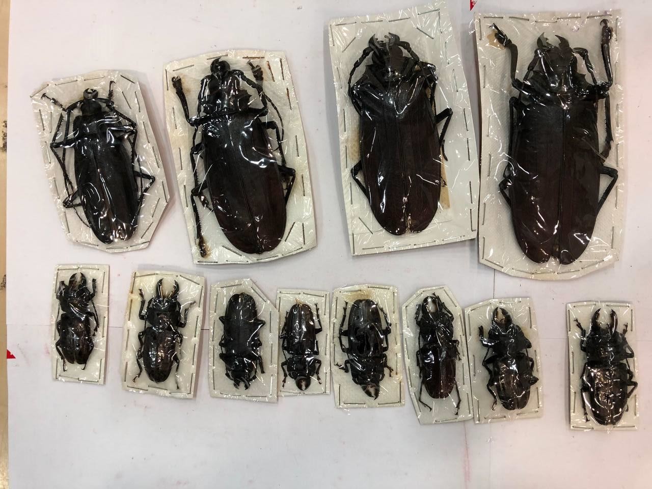 Как установила экспертиза, жуки — это трофеи неотропического царства. Среди них — крупнейший в мире ночной дровосек-титан длиной почти 20 сантиметров, а также жуки-долгоносики и носороги из семейства пластинчатоусых.