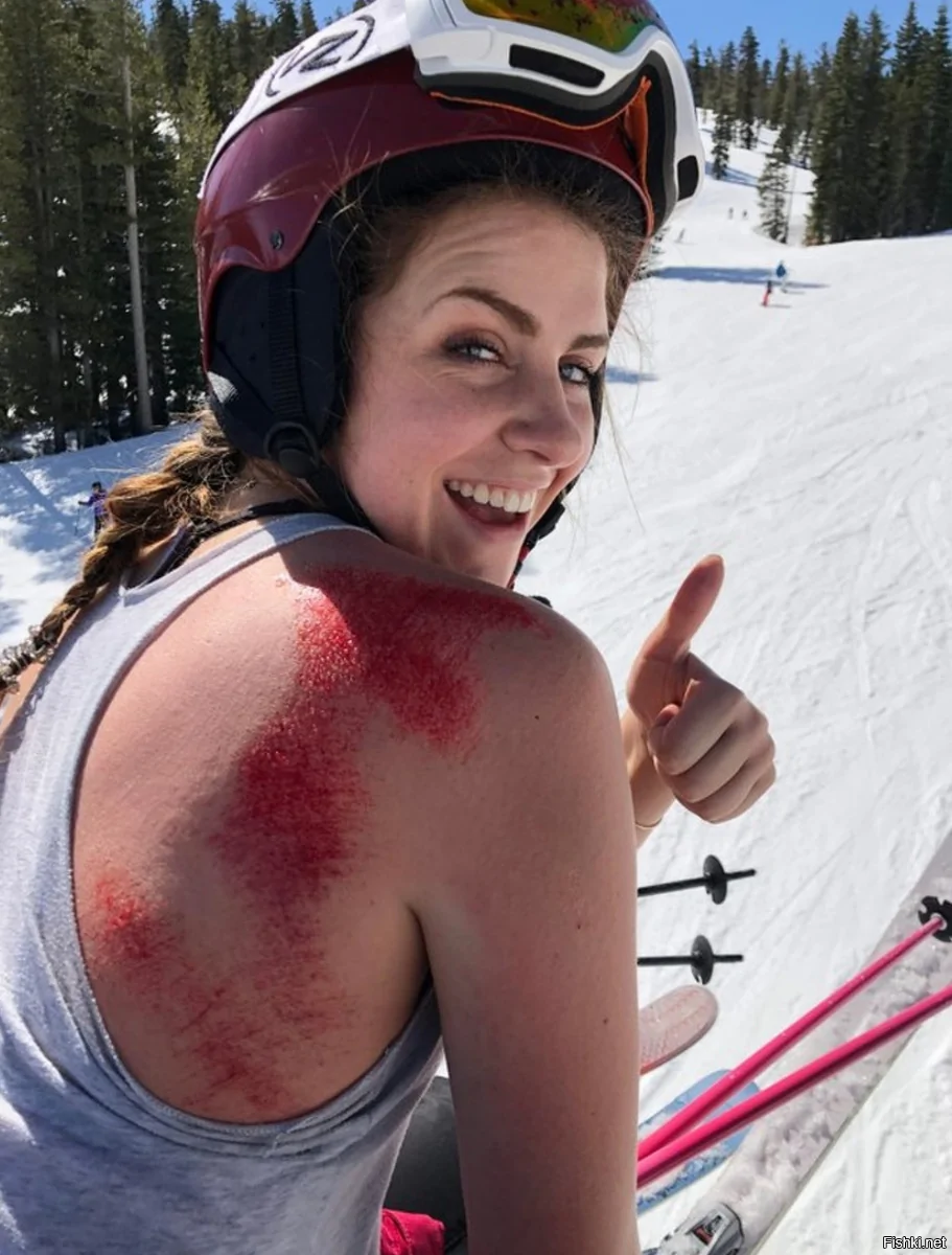 Лыжи в хлам, рука сломана, костюм порван, голова вся в крови, половины