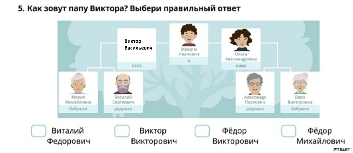 Кто такой Виктор? Тут вообще нет никого с именем Виктор. Откуда мы должны знать, как зовут его отца? Вероятнее всего в задачке нужно выяснить, как зовут папу Максима, который и находится в пустом квадрате. Тогда можно догадаться, что его зовут Иван Васильевич. Но в вариантах ответа также нет никакого Ивана Васильевича. Кто составлял этот бред?