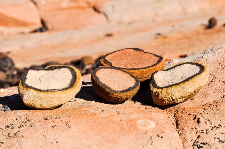 На заре формирования этой породы грунтовые воды, насыщенные органическими веществами и кислотами, начали просачиваться сквозь пористый песчаник. Этот процесс растворял и вымывал железо, обесцвечивая пласты. Когда химический состав воды менялся, происходила кристаллизация железа, которое постепенно цементировало песчинки, образуя твёрдые концентрические слои. Миллионы лет эрозии разрушили более мягкий окружающий песчаник, обнажив эти стойкие конкреции, которые теперь усеивают поверхность целыми полями.